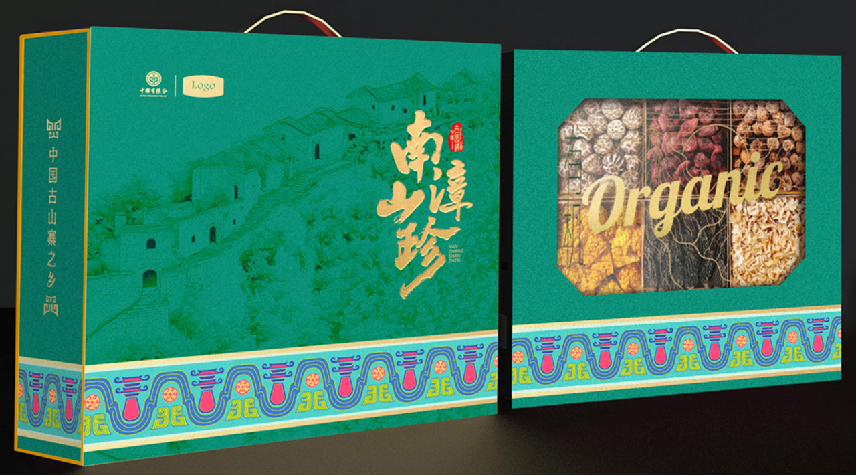 此款礼盒以“古山寨文化”为核心,礼盒正面中心以铅绘展现南漳春秋寨之巍峨壮阔,气势恢宏。盒底纹样,提取自南漳博物馆的古山寨文物,重组设计,兼具复古与潮感。反面巧用镂空设计,直观呈现南漳山珍之有机纯粹与高品质,尽显自然与文化的和谐共生之美。